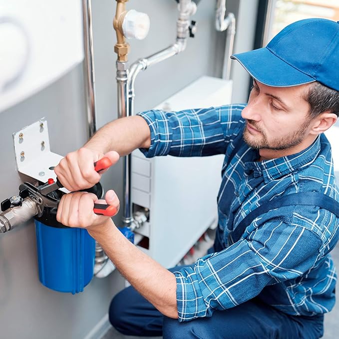 - EASY INSTALLATION: The big filter housing blue comes with all tools required for installation, including a wrench, heavy-duty steel mounting bracket, 4 screws. The built-in red pressure-relief button for water pressure release, making it easier for filter replacement