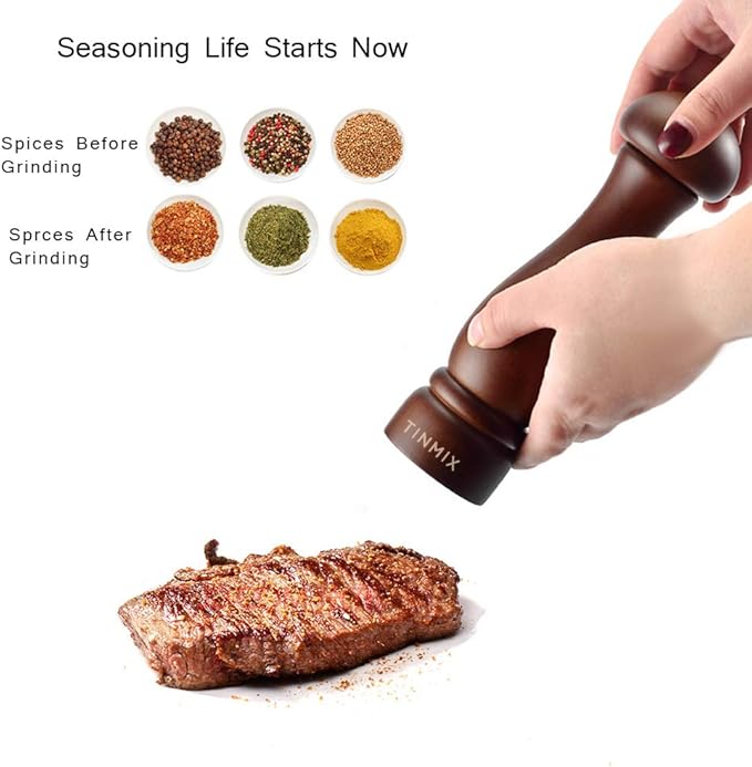 Wooden Pepper Grinder or Salt Mill, TINMIX Black Peppercorn Grinder with Adjustable Roughness Ceramic Rotor and Easily Refillable, Oak Wood Capstan Sea Salt Mill for Your Kitchen (5 inch)