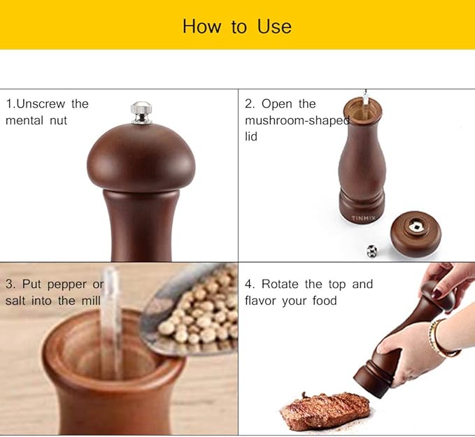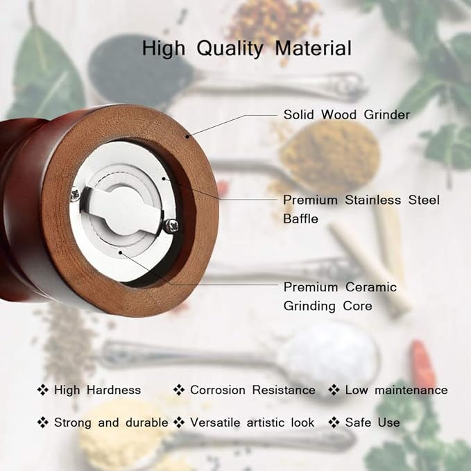- Solid Wood Material - The natural oak wood salt and pepper grinder kit include ceramic rotor, non-corrosive, safe to use. The wooden pepper mill surface treated with baking varnish which touches smooth and comfortable when flavor your food