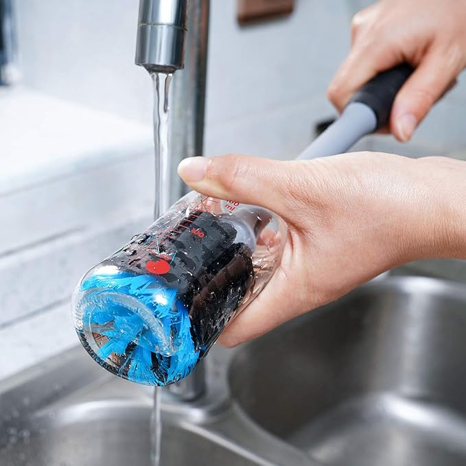- Dual-Function Bristles: The Bottle Brush Head has two types of bristles for gentle cleaning and serious scrubbing; soft black bristles are gentle enough to wine glasses and crystal without scratching, while the stiff blue bristles on the tip are firmer, give the hard-to-reach corners and bottom of bottles a serious scrub