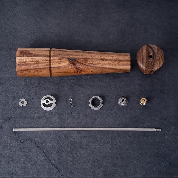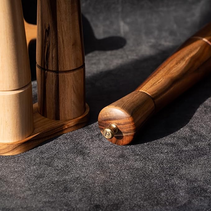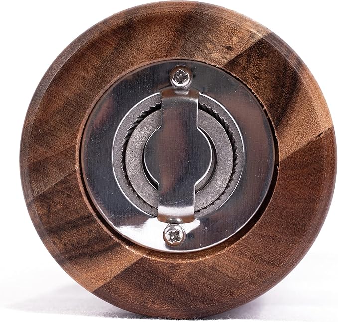 - The pepper mill is built with sturdy and beautiful acacia wood grain. That adds a strong presence to the tabletop, kitchen or counter