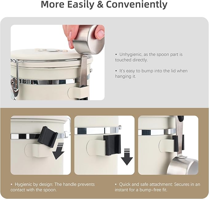 - 【BUILT-IN DATE TRACKER】A simple yet incredibly useful feature! The date tracker lets you monitor when the canister was last filled, helping prevent your coffee from going stale unnoticed. A stainless steel scoop is conveniently attached to the side, so you’re never left searching for a measuring spoon. Features a superior airtight seal for maximum freshness.