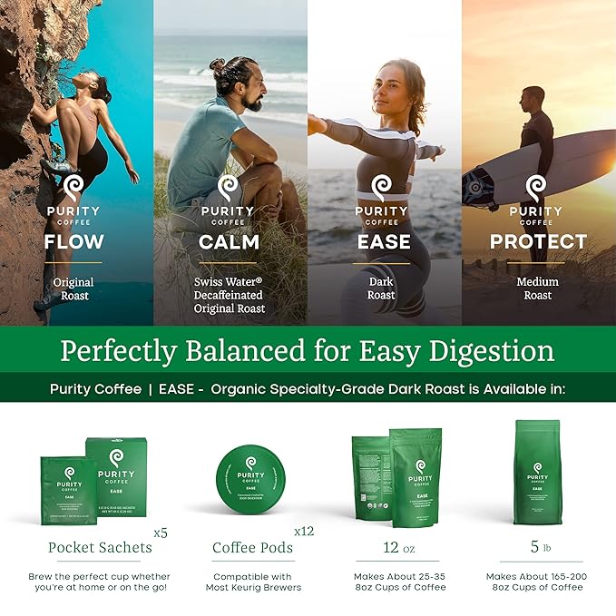 Purity Coffee EASE Dark Roast Low Acid Organic Coffee - USDA Certified Organic Specialty Grade Arabica Whole Bean Coffee - Third Party Tested for Mold, Mycotoxins and Pesticides - 5 lb Bag