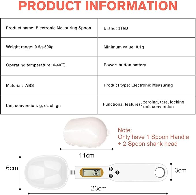 - 【High Precision Sensor】- 3T6B digital measuring spoon scale is equipped with precise sensor and LCD display, the division value is 0.1g. The measuring range is 0.5g-500g. NOTE: When using, please hold one end of the handle of the gram measuring spoons to keep it LEVEL and STABLE without shaking.