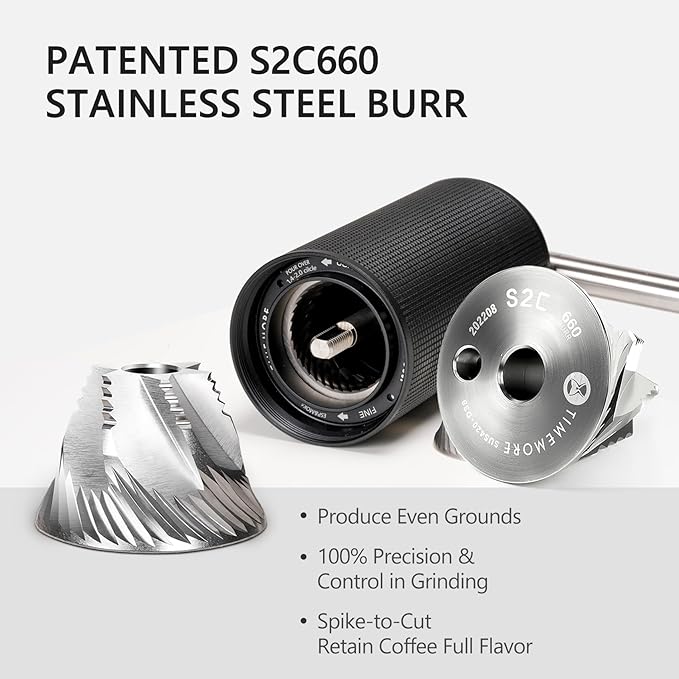 - [ What is C3 ESP Pro? Special Design For Espresso ]Equipped with patented S2C660 stainless steel burrs with higher precision and efficiency. C3 ESP Pro hand coffee grinder provides more precise grinding adjustment, minor adjustment of 0.0233mm per click allows you to easily achieve the perfect coarseness for your preferred fine to coarse. From French press to espresso coffee, TIMEMORE has you covered