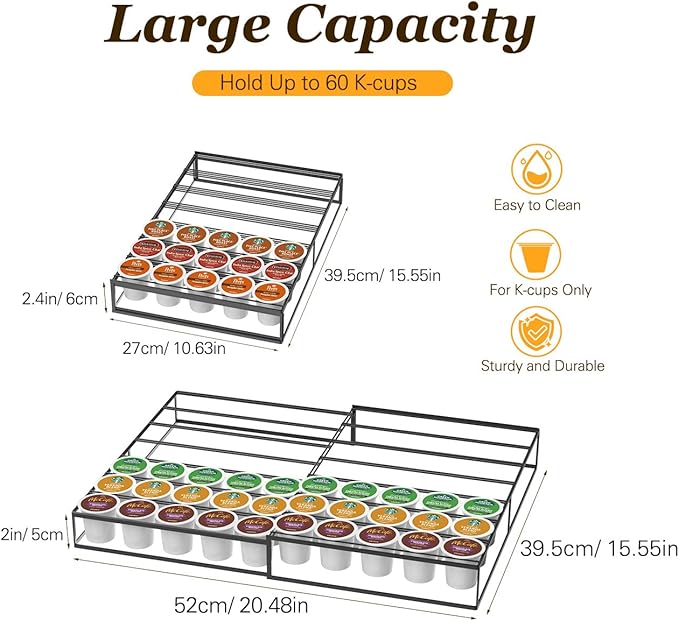 - 【Countertop or Drawer Use】Our coffee pod holder measures 10.63 "L x 2.4 "H x 15.55 "W (expandable to 20.48 "W). Its compact design allows for flexible placement on countertops, cabinets or drawers (drawer height must be greater than 3 inches).
