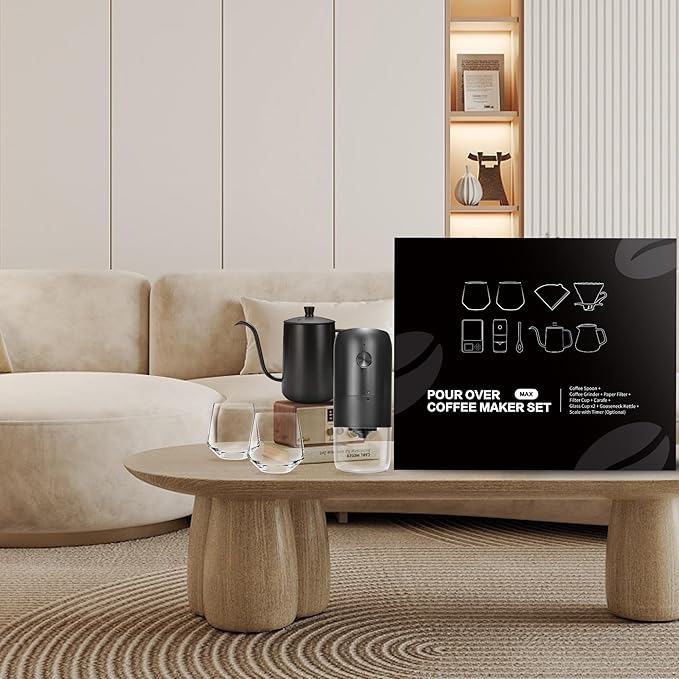 - š ALL-IN-1 SET: This set comes with 1pc 32oz gooseneck kettle, 1pc glass dripper, 1pc 20oz glass coffee server, 50pcs paper coffee filters, 2pcs 10oz glass coffee cups, 1 pcs coffee spoon, 1pc electric coffee grinder, 1pc coffee scale. This is a professional pour over coffee maker kit that is ideal for professionals.
