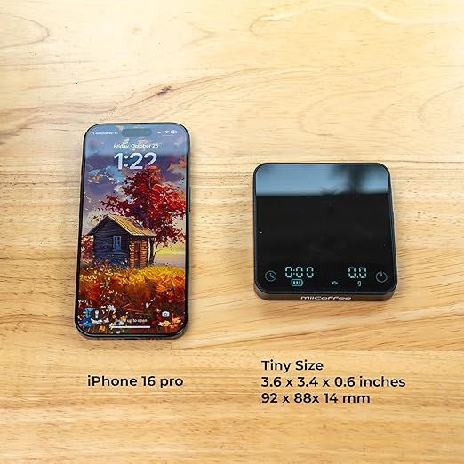 - 【Tiny and Feature Rich】MiiCoffee Minipress Coffee Scale fits in your palm and under any espresso machine. Size is 3.6 x 3.4 x 0.6 inches or 92 x 88x 14 mm.