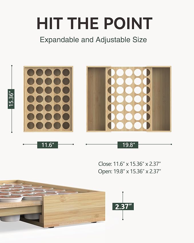Larger Expandable Bamboo Coffee Pod Holder for Counter Drawer Display, 35 Pod Capacity, K-Cup Pods - Tea Bags Storage Organizer Holder (Bamboo)
