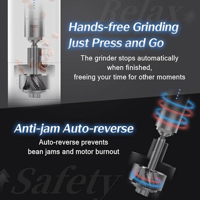 - [Crush Beans, Not Your Motor] – Smart auto-reverse clears jams and protects the heart of this battery powered coffee grinder. One-touch start and auto-stop make the portable coffee grinder safe, simple, and consistent—so you focus on sipping, not babysitting.