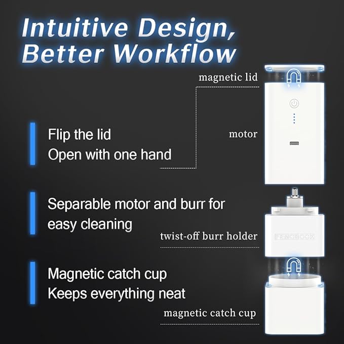 - [Your Grinder Shouldn’t Need a Toolbox] – Twist to separate motor and burrs—no tools, no mess—so your cordless coffee grinder stays spotless. The magnetic grounds cup snaps on/off for fast dosing and easy rinsing, keeping this coffee grinder portable and ready for any brew bar