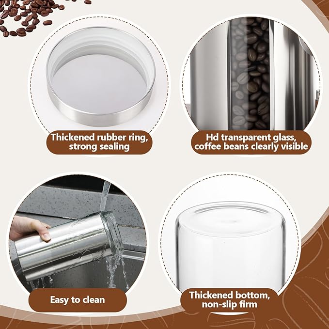 - Elegant Stainless Steel Glass Containers Set: there are 3 pieces stainless steel glass coffee bean containers, each measuring about 8.86 x 3.90 inches; Also have 2 wooden metal coffee scoops and 1 wooden container stand, your coffee essentials are stylishly organized and within easy reach, ensuring an elegant and practical kitchen storage solution