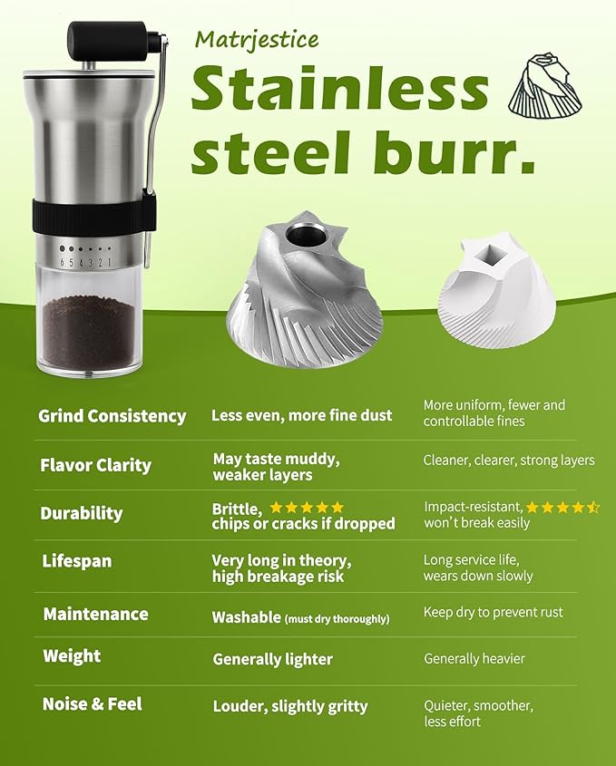 Manual Coffee Grinder with Stainless Steel Burr - 1.12oz Capacity Handheld Mill for Espresso, Drip, Cold Brew with 6 Adjustable Settings & Quiet -Extra Fine Grinding (Stainless Steel Burr)