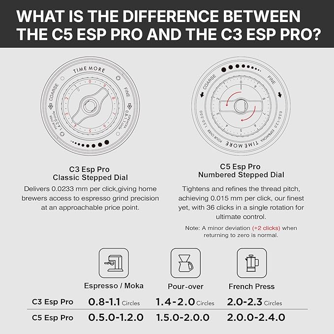 - [ What is C5 ESP Pro? Special Design For Espresso ]Equipped with patented S2C-042-III stainless steel burrs with higher precision and efficiency. C5 ESP Pro hand coffee grinder provides more precise grinding adjustment, minor adjustment of 0.015mm per click allows you to easily achieve the perfect coarseness for your preferred fine to coarse. From French press to espresso coffee, TIMEMORE has you covered