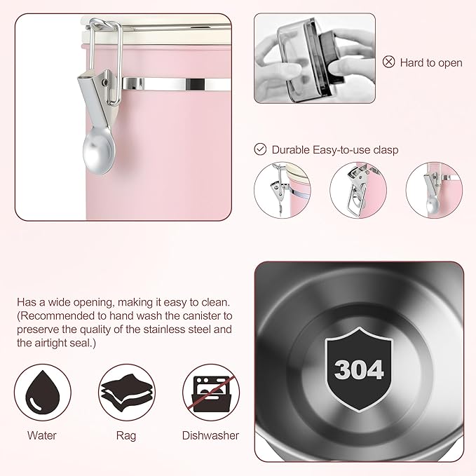 - 【CARE & WARRANTY】Backed by a 1-year warranty for peace of mind. Designed with a color-coordinated lid and silicone seal, this canister combines function with visual appeal, making it a must-have for any kitchen. To clean, simply hand wash with warm, soapy water and dry thoroughly before refilling. Avoid using abrasive cleaners or scrubbing pads that could damage the stainless steel finish. Regularly inspect the silicone seal to ensure proper function, and replace it as needed.
