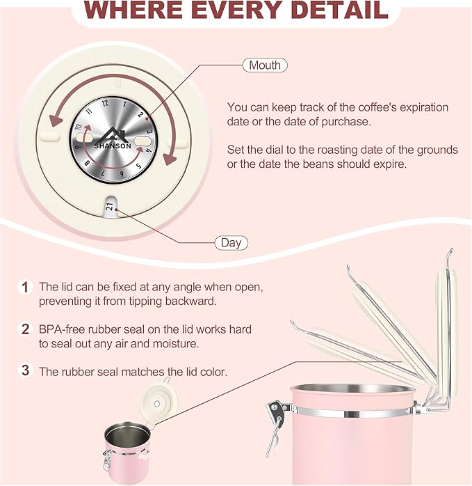 ShanSon Coffee Canister Airtight Coffee Container Stainless Steel Coffee Bean Storage Container with Scoop Coffee Canister for Beans Grounds Sugar Flour Tea Cereal,22OZ, Pink